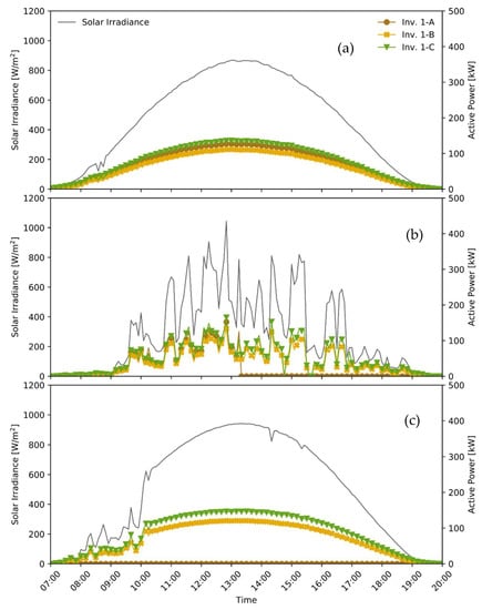 Analysis of sensor signals of the Inverter 1 on 30st August (a), on 31th August (b) and on 1st September (c)—Solar Irradiance over the Active Power of the inverter blocks.