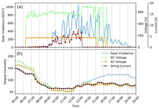To give more hints on this fault event, Figure 5 compares the signals Yn,7–8 and Yn,36 gathered from inverter 1 block A (Figure 5a) and the corresponding CNA metrics. Specifically, Figure 5b illustrates the behavior of degree centralities of solar irradiance, DC voltage, AC voltage and string currents.