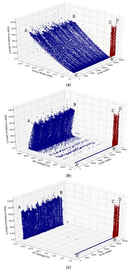 Exploratory data analysis applied to sensor signals from block A of the inverter 1. Trends of (a) active power, (b) DC voltage and (c) AC voltage (x-axis), against solar irradiance (y-axis) and time (z-axis).