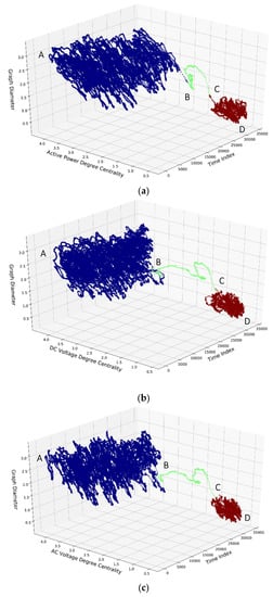 - B to C (from 06:30 to 16:30 of 31 August), finally includes the sub-set of operations that transition the inverter to fault. This cluster contains the series of points connecting the previous groups. While the network diameter ranges between 2.5 and 1.5, the degree of centralities gradually decreases from 2 to about 1 for inverter 1 block A voltages and active power. This circumstance permits us to infer that this cluster, possibly, isolates the evolution of inverter operating conditions from the precursor (6:30) to the automatic block shutdown (13:30) including also the preliminary phase of fault evolution with non-zero AC/DC voltages (16:30). As such, it demonstrates the possibility of identifying at 7 h long pre-fault event which anticipates the evolution of inverter operating conditions on 31 August.