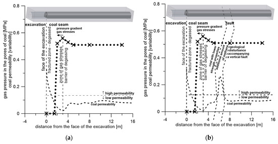 The pressure of gas in the coal pores as a function of the distance from the excavation face—degassed zone, gas stresses zone, and coal permeability—the excavation free form geological disturbances (a) and the excavation with geological disturbances (b).