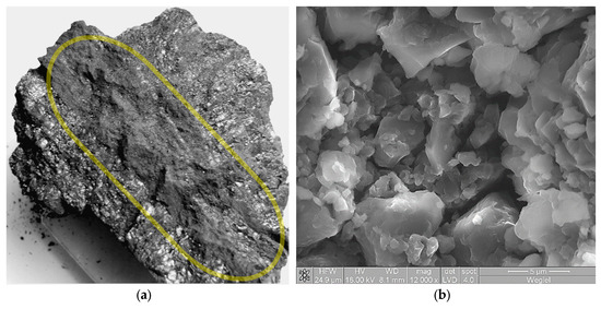 A piece of coal from the post-outburst mass from the Zofiówka coal mine with a cataclastic band in the middle (a); SEM image of cataclastic coal from the Zofiówka coal mine—magnification 12,000× (b).