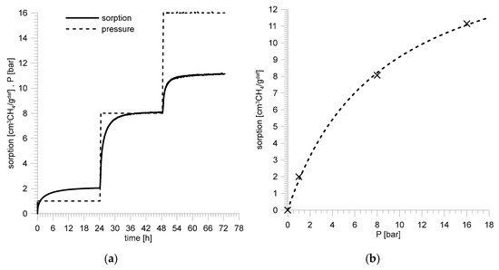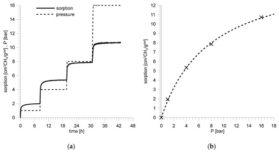 Direct results of the measurements are presented in graphs showing changes of a sample mass during the process of sorption (Figure 4a and Figure 5a). Asymptotic values of sorption capacities for particular pressures were used to determine the sorption isotherms (Figure 4b and Figure 5b).