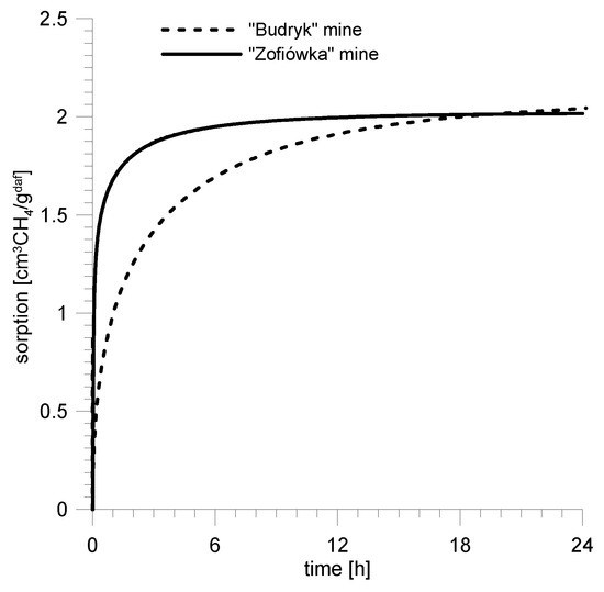 The analyzed coal samples show significant differences in terms of the aspects describing the rate of methane emission from coal. It is clearly visible on the graph showing the time recording of methane emission from coal (Figure 6) that the sample from the post-outburst mass from the Zofiówka coal mine emits methane considerably faster than the sample from the post-outburst mass from the Budryk coal mine.