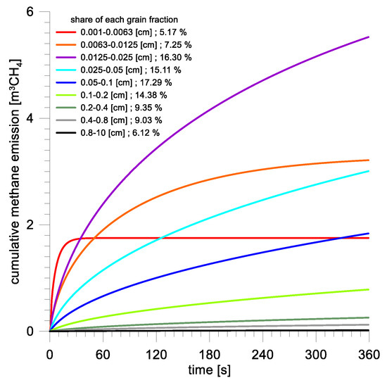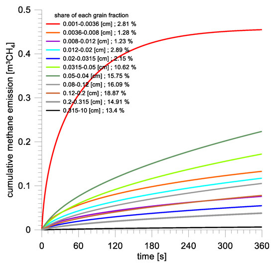 The methane emission is calculated as a weighted sum from all analyzed grain fractions but the weights correspond with the percentage shares of particular fractions. It is extremely important because the emission rate depends on the squared radius of the sphere (or the height of the plane sheet).