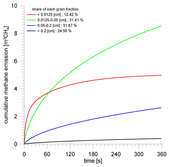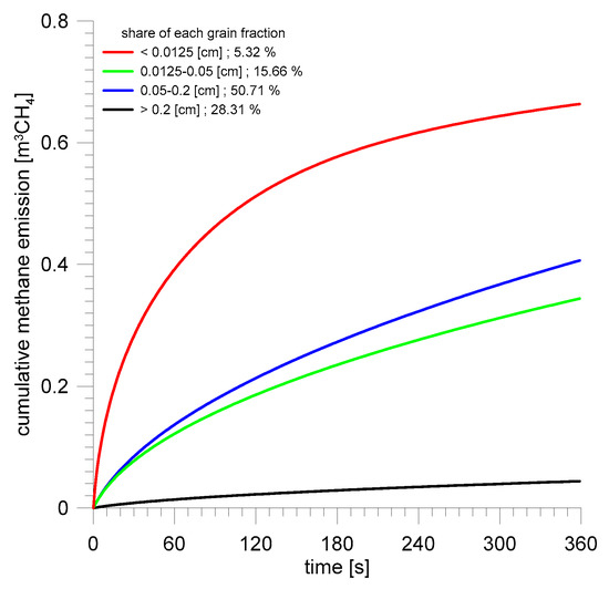 The other differences also result from the grain size distribution of the post-outburst masses. The weaker, structurally changed coal from the Zofiówka coal mine was crushed during the outburst to smaller grains than the coal from the Budryk coal mine. The rate of methane emission from coal depends on its grain size in the squared power or the height of the plane sheets, so the influence of comminution is substantial. Figure 8 and Figure 9 show the grain size distributions of the post-outburst masses. Figure 10 and Figure 11 present cumulative methane emissions for particular grain fractions in the initial phase of the outburst.