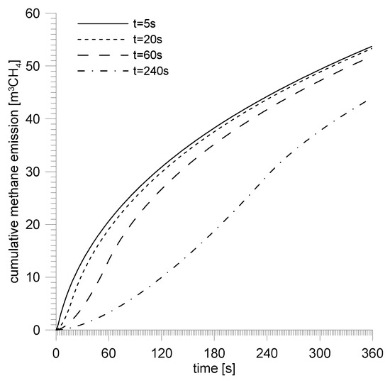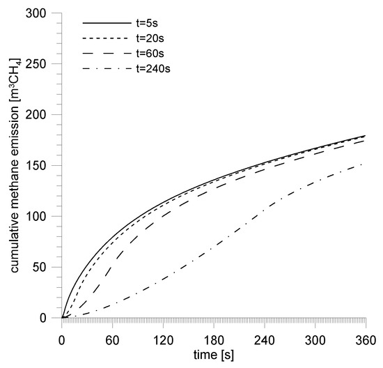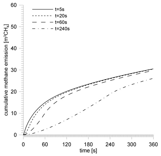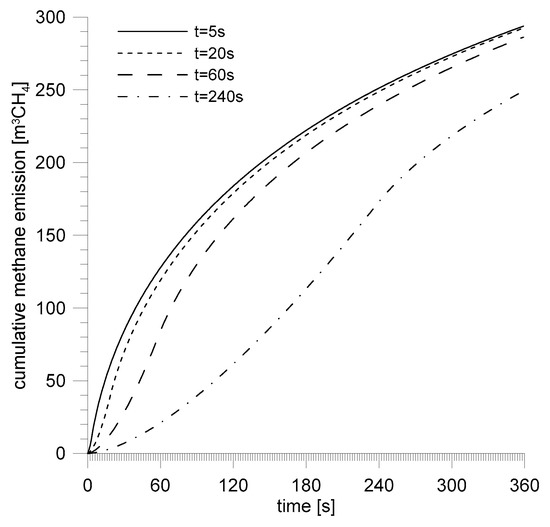 Figure 15 shows cumulative emissions for particular assumed time periods of outbursts. On particular curves we can see inflection points which correspond with the value of the maxima of methane emission curves and so the moments of time for which the phase of the outburst connected with crushing of the body of coal finishes.