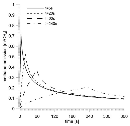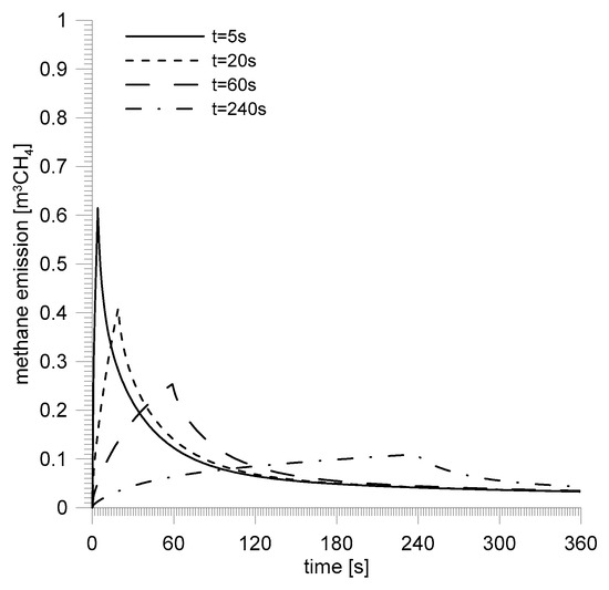 The basic results of the simulation are presented in the graphs below. Figure 14 shows the methane emission reproducing the conditions of Zofiówka outburst. Depending on the assumed duration of the experiment, the time period in which the course is rising changes. In this phase destruction of the coal material takes place. It is discretized in s, which translates into the increase of the emission from the already crushed material. The highest instantaneous value of the emission corresponds with the last s of the process of coal crushing during the outburst. The completion of the outburst phase during which the destruction of the material takes place is started by a fragment of the decreasing course of methane emissions from coal. At this stage the total emission is a compound of a number of emissions which started at the moments of crushing of particular fragments of the unmined body of coal.