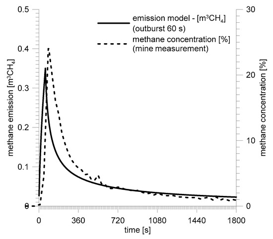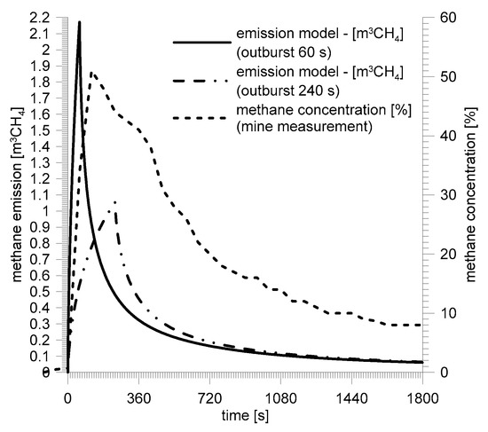 The results of the model of methane emission from coal were compared with the CH4 concentration changes, which were recorded during the outbursts. Assuming that airing of the excavation was at a much higher level than that of methane emission, the expected shape of the curve describing the concentration should be similar to the curve of methane emission with a small inertia. In the case of the Zofiówka coal mine, the shapes of the momentary methane emission closest to courses of the concentration changes correspond with outburst durations between 60 s and 240 s. In the case of the Budryk coal mine, the closest similarity corresponds with the model emission determined with the assumption that the outburst lasted 60 s. The summary amount of the liberated methane, estimated by the mine services based on the readings from the methanometer installed at the outlet of the excavation where the outburst occurred, was considerably higher than the model amount in the case of Zofiówka and similar in the case of Budryk. The explanation for this is connected with the nature of the analyzed outbursts. The unrecognized tectonic disturbance from the Zofiówka outburst in the form of two interlocking faults was an additional volume of good permeability in which a considerable amount of methane was accumulated. The Budryk outburst had no characteristics of a tectonic disturbance, and its model analysis showed very close similarity with the measurements in situ.