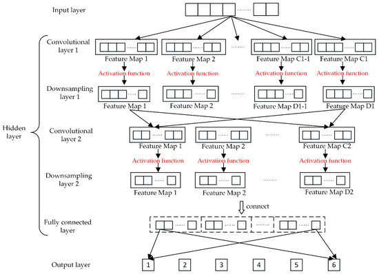 The CNN consists of an input layer, an output layer and a hidden layer. As the most important part of the whole network, the hidden layers of the CNN include convolutional layers, an activation function, downsampling layers and a fully connected layer, as shown in Figure 2. In this paper, the classification of incipient cable failure from the normal signal and the overcurrent disturbance signal is achieved through a typical CNN structure with two convolutional layers.