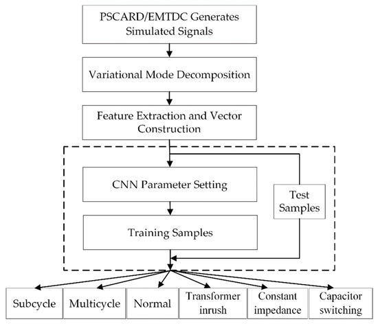 This paper presents a new approach for incipient cable failure recognition and classification based on VMD feature extraction and CNN classification (Figure 1). Via VMD, features of each decomposed mode for the original signal are extracted, and feature vector is input into the CNN to recognize incipient cable failure. The paper is organized as follows: in Section 2, the VMD principle, mathematical model and CNN algorithm are described. In Section 3, experimental data are generated by constructing a model of incipient cable failure and overcurrent interference in PSCARD/EMTDC. Next, the complete experimental results are shown. Compared with traditional machine learning algorithms (DT, KNN, BP, and SVM), the proposed approach not only can recognize incipient cable failure state well but also has good noise immunity. In Section 4, the produced results are commented and the limitations of the research are expounded. In the last section, the conclusions are summarized.