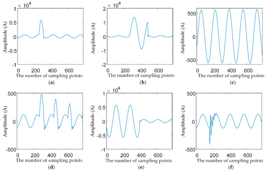 Incipient cable failure generally consists of single-phase ground failure, which can easily lead to phase-to-phase failure. Typical failure types mainly include subcycle incipient failure and multicycle incipient failure. As in references [4,5,6,7], the characteristics of incipient cable failure can be expressed as follows: (a) the failure is of short duration or low current amplitude; (b) the failure occurs at the peak of voltage; (c) a subcycle incipient failure lasts for 1/4 cycle, and when the current passes zero, the failure disappears automatically; multicycle incipient failure general lasts for 1–4 cycles, and when the arc disappears, the failure disappears automatically. In this paper, six simulation signals are used, namely, subcycle incipient cable failure, multicycle incipient cable failure, normal signal, transformer inrush disturbance, constant impedance failure and capacitor switching disturbance, as shown in Figure 5. All simulation samples are generated based on the actual interference waveform. The failure location is random, and signals of the same class exhibit differences.