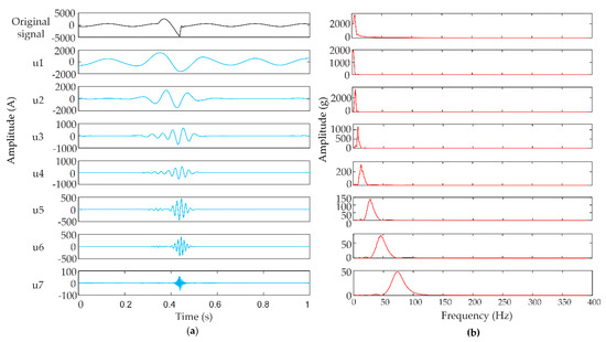 Due to space limitations, only Figure 6 and Figure 7 show the results and spectra of VMD for multicycle incipient cable failure and transformer inrush disturbance; the analysis process of other signals is similar. It is obvious that the waveforms of each mode corresponding to different signals differ greatly. Regarding spectra, two types of signals composed of low-frequency and intermediate-frequency content are better decomposed by VMD, so that it is fully prepared for subsequent feature extraction.
