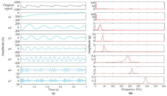 Results and spectra of VMD for multicycle incipient cable failure: (a) Modes; (b) Frequency spectra.