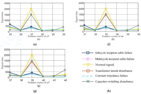 Feature extraction based on VMD: (a)–(g) denotes the respective feature vector FVk of the u1–u7 decomposed modes. (h) denotes the representation of different signal types.