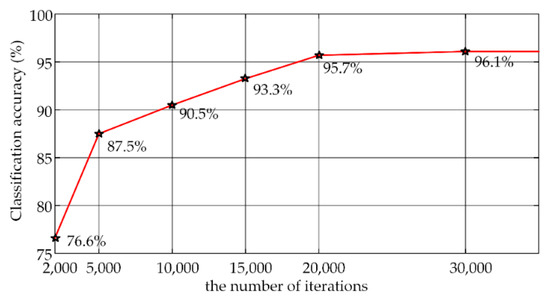 The structure of the CNN has an important impact on the network performance and output accuracy. Considering the computational complexity and accuracy, the parameters that are more effective for simulation data are finally selected in this paper, as indicated in Table 1. At the same time, the learning rate is set to 1, with 60 samples for each training and more than 30,000 iterations. In theory, the more iterations of the deep learning network, the higher the accuracy. In Figure 9, the impact of iteration number on classification results is shown.