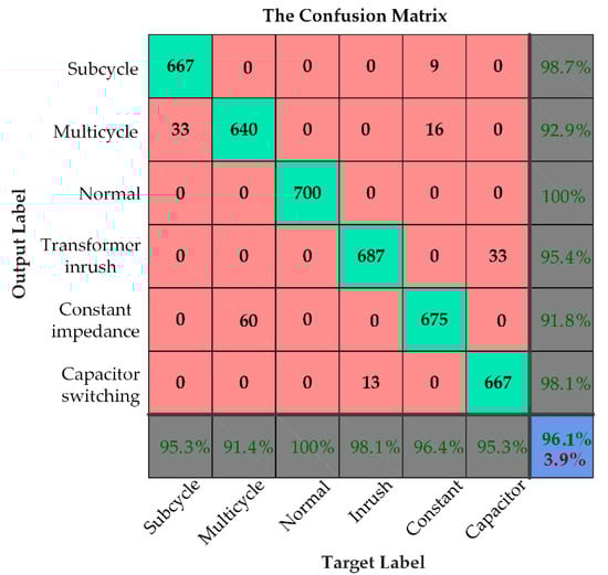 For the final classification results of the subcycle incipient cable failure, multicycle incipient cable failure, normal signal, transformer inrush disturbance, constant impedance failure and capacitor switching disturbance, the performance of the model is presented in the form of a confusion matrix. As shown in Figure 10, the overall prediction accuracy is 96.1%. The rows represent the output labels, the columns represent the target labels, and the diagonal represents the number of samples correctly classified for each class. The results show that the most common mistake is to classify multicycle incipient failure as constant impedance failure; the recognition rate of multicycle incipient failure is 91.4%. The recognition rate of the normal signals is all correct, achieving 100%.