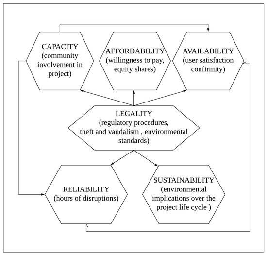 - Legality: This evaluation attribute in the context of developing countries corresponds to the barriers to the micro-grid projects, such as incompetent policies for rural electrification, lack of legal documents for revenue shares, lack of legal procedures for property transfers for the project, and the lack of conformity of the projects to technical standards. The following questions may be asked: