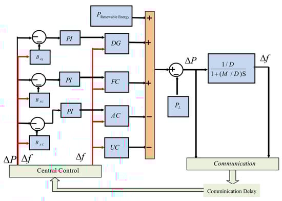 The central controller needs frequency information to appropriately order the microgrid power generation and absorption units. As discussed in reference [33], frequency and power information are to be sent or received with a specific time delay by a telecommunications platform, which is very effective for the stability of the microgrid. The communication delay with other delay sources are defined as a measurement delay in reference [34] and applied for primary and secondary controllers. The microgrid mentioned before is shown in Figure 1. Δf is the frequency deviation and input signal of the controller, and the changes in the power generation and storage units as the output of this system. M represents the total inertia of a microgrid. When a difference between the generation and consumption occurs because of the load along with power generation increasing/decreasing, the frequency deviation of the microgrid depends on the inertia value and the load demand. It is assumed that the solar unit has variable and uncontrollable power. The central controller block sets a PI controller output for each power unit. The central controller unit block receives the network frequency information with a delay. The power and frequency information are passed through with a telecommunication system delay. The Diesel Generator Unit, Fuel Cell Unit, and electrolyze unit are equipped with primary and secondary frequency controllers. The Ultra-Capacitor unit participates in primary frequency control using a frequency signal. The parameters of this microgrid and power units are given in Table 1.