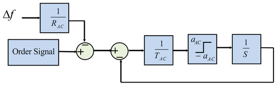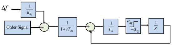 The diesel generators are used to compensate the power required by the microgrid by using a governor and a speed drop system. The governor controls the fuel input of the fuel engine by adjusting the fuel throttle mechanism. The gasoline or gas engine acts as a turbine and moves a synchronous generator. The diesel generator governor can be modeled by a first-order conversion function that is described in Equation (1).