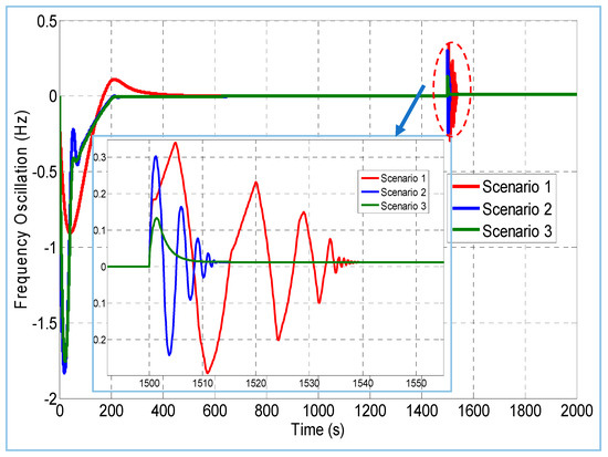 Comparison of the microgrid responses in terms of frequency in three scenarios.