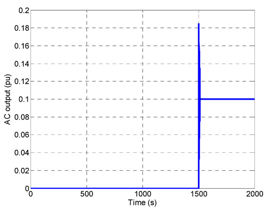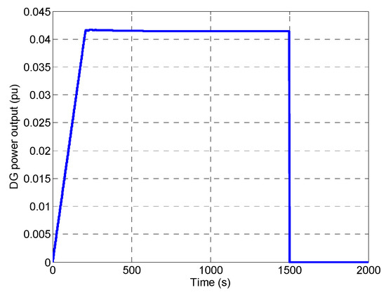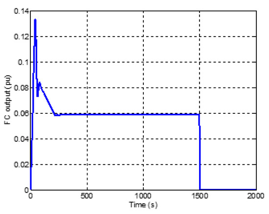 These scenarios show the effectiveness of the selected solution in overcoming frequency oscillation. In all the scenarios, the load and renewable energy source step changes are considered in the same profile. The magnitude of the load demand is equal to 1/1 per unit. When the simulation time reaches 1500 (s), it will reach 0.9 per unit. In contrast, the generation of renewable energy units is equal to one per unit. The frequency behavior of the microgrid in this section is shown in Figure 8. The microgrid frequency fluctuation has decreased with the application of optimum parameters and can be clearly seen in Figure 8. Meanwhile, the telecommunication system delay increases the undershoot and settling time of the frequency fluctuation. Up to t = 1500 s, diesel generator and fuel cell are expected to generate power, and after this instance the electrolysis unit is expected to absorb unbalanced power. The dynamic responses of the power sources and the electrolyze unit, while applying the optimum parameters, can be investigated using simulation results. Output powers of the source for the diesel generator, the fuel cell, and the electrolyze unit are shown in Figure 9, Figure 10 and Figure 11, respectively. As can be seen from these figures, the electrolysis unit and diesel generator have the fastest and the slowest dynamic behavior responses, respectively. In the initial simulation time, the fuel cell injects power to grid with a high rate to compensate frequency drooping. Up to t = 1500 s, in steady state condition, the diesel generator and fuel cell contribute in power balancing and frequency stability.