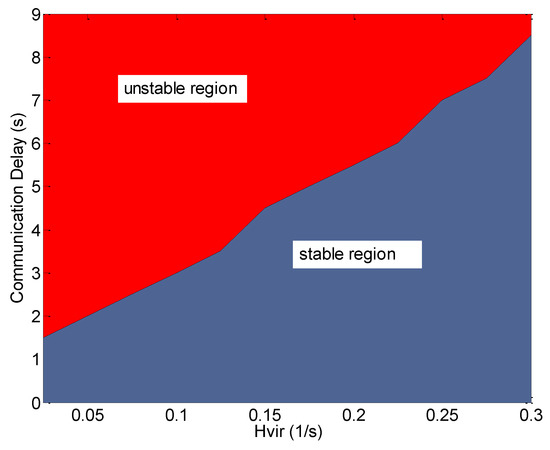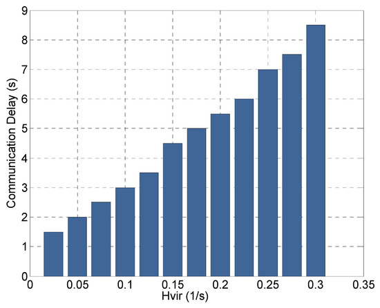 Due to the high penetration of renewable energy sources, the actual inertia of the microgrid systems is small. This phenomenon shows its effect on steady frequency oscillation and high overshoot and undershoots in microgrid frequency responses. By increasing the communication delay, the stability margin of the microgrid can be improved. By increasing the microgrid inertia by increasing the virtual inertia value, the microgrid frequency is made less sensitive to the increasing commendation time delay. The studied microgrid behavior, for a different time delay value, is stable under the special condition that is shown in Figure 12. Two areas are distinguished in this figure. For a given Hvir value, if the time delay value is in the blue area, the system will be stable. The maximum virtual inertia margin that guarantees the stability is shown in Figure 13. To derive Figure 10 and Figure 11, the conventional repetition process is used. The virtual inertia and time delay step changes are considered as being 0.5 Hz and 0.025 s, respectively.