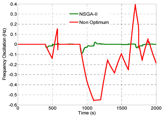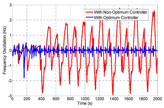 The frequency behavior of a microgrid while applying the specific uncertainties, optimum and non-optimum parameters is simulated and the results of these simulations are shown in Figure 16. The optimum-based controller can overcome power-unbalancing events and stabilize the frequency.