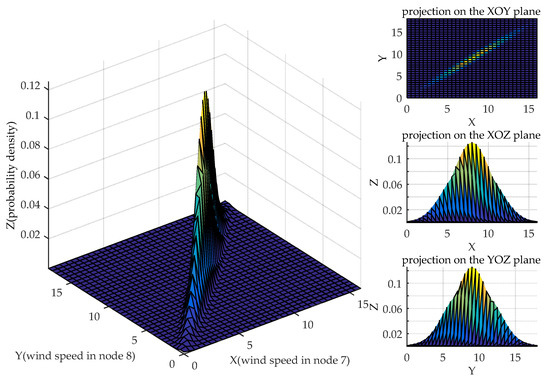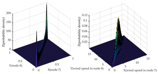 According to the 8000 generated wind speeds in Section 5.1.1, non-parametric kernel density estimation is used to obtain the probability density function of these wind speed samples, and their joint probability density function is shown in Figure 3. In this figure, the x-z and y-z planes denote the probability density function of wind speed in node 7, respectively. Apparently, the probability density function of wind speed in nodes 7 and 8 obey normal distribution because the sample number is huge, which verifies the effectiveness of using non-parametric kernel density estimation to obtain the probability density function of wind speed. In this case, we suppose that the wind speeds in node 7 and 8 obey the normal distribution in Section 5.1.1. Therefore, we select the normal copula function to establish their wind speed joint distribution model; the copula function and the joint probability density function solved through this copula are shown in Figure 4.