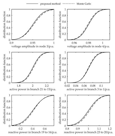 In order to verify the accuracy of the proposed method in the probability distribution characteristics of the output variables further. Taking the voltage amplitude of node 3 and node 4, the active power of branches 21-15 and 3-1, and the reactive power of branch 19-16 and 23-20 as examples, this paper calculates their distribution function using the proposed method and Monte Carlo method. The distribution functions are shown in Figure 6. From this figure, the distribution curve of these two methods are close to each other. Through verification, the distribution function of output variables in other nodes or branches using these two methods are very similar, and the maximum relative error is 2.14%, which illustrates that the proposed method could accurately obtain probability distributions, and further proves that the proposed method has higher precision.