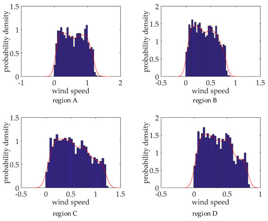 The East Inner Mongolia region includes Chifeng region (region A), Tongliao region (region B), Hulunbeier region (region C) and Xing’an League region (region D). The East Inner Mongolia Power Grid has formed a network with 500 kV grid as the backbone network frame, 220 kV grid to achieve full coverage of the county, 110 (66) kV grid in chain ring or radiation form. By the end of 2018, the East Inner Mongolia Power Grid has 670 substations of 66 kV and above, and the transformer capacity is 65.09 million kVA and the total length of line is 37,819 km [25]. The wind speed is taken from the measured data of region A to region D. The power factor, rated wind speed, cut-in wind speed and cut-out wind speed of the wind turbine are the same as those in Section 4.1. Supposing the wind speed base value is 15 m/s, and standard the wind speed of region A to region D. Divide the standardized wind speed 0–1 to 20 intervals, and the length of each interval is 0.05, calculate the frequency and probability density the wind speed in region A to region D in each interval, which is shown as the blue bar chart in Figure 7. On this basis, non-parametric kernel density estimation is used to obtain the probability density function of wind speed in region A to region D, which is shown as the red line in Figure 7.