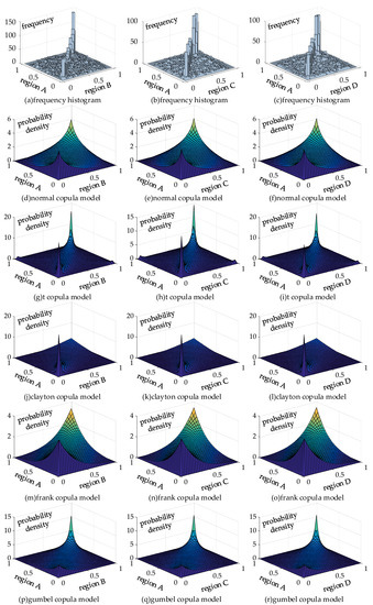 This paper uses C-vine to decompose joint distribution, and region A is regarded as the root node. The maximum likelihood estimation method is used in non-parametric kernel density estimation based probability density function of the two regions to obtain the correlation coefficient. The correlation coefficient of different copulas is shown in Table 5. On this basis, the probability density function of different copula types are shown in Figure 8.