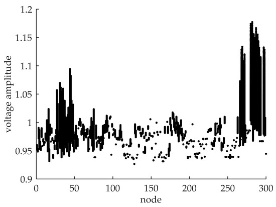 In this Section, a voltage state assessment of the East Inner Mongolia power system is evaluated. The number of wind farms in the power system is 32. Monte Carlo sampling is used for 3000 times to generate correlation wind speed samples according to the vine copula function, and the correlated wind speed samples are converted to independent wind speed samples using the Rosenblatt transform. On this basis, power flow is calculated using probabilistic load flow. The voltage amplitude results are shown in Figure 9. In this figure, we could see there exists voltage beyond limits circumstance when large-scale wind power integrated in the power system. Through verification, voltages beyond limit occur when the wind speed is huge, especially at the nodes at which wind power accessed rises more obviously as the wind speed increases; except for the nodes that wind power accessed, the nodes with load accessed are subject to voltage beyond limit circumstance as the wind speed increases, this is because the voltage adjustment ability of these nodes are weak. With the change of wind speed, the power flow value and direction are easily to change, and the voltage of these load nodes varies according to load regulation effect. The voltage of the nodes without wind power accessed, but with large capacity thermal power units, do not rise obviously or remain constant, the reason lies in that large capacity thermal power units bear the adjusting role in the power system; with a change of wind power or load, these node must adjust their output so as to meet the power supply and demand balance, so the voltage adjusting ability is ascendant in this node, and the probability of voltage beyond limits in these nodes is small.