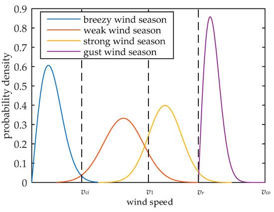 Now, non-parametric kernel density estimation is applied to fit the wind speed distribution of these four wind seasons using wind speed samples. The Gaussian kernel function is selected as the kernel function, and the expression is shown in Equation (26), where Xi is the wind speed samples. If the window width of the Gaussian kernel function is 1, then the non-parametric kernel density estimation of the wind speed in different wind seasons can be expressed as Equation (27). Using Equations (26) and (27) to calculate the probability density function, region A is shown in Figure 10.
