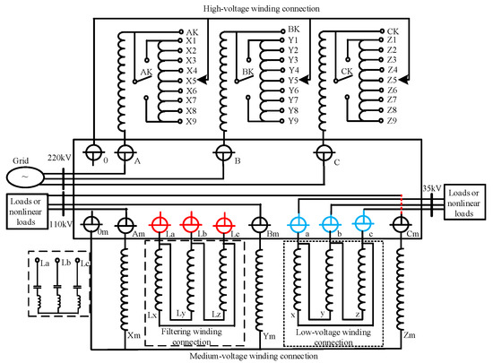 Since the IF method is different between active and passive filtering methods, it is the preeminent solution against nonlinear loads, which it achieves by fully utilizing the electromagnetic inductive filtering principle of the transformer, which is applied in the industrial direct-current (dc) supply system and high voltage dc system [20,21,22]. For the four-winding inductively filtered rectifier transformer (FW-IFRT), the ratings of the wye-connected bank of secondary winding of the load side and the delta-connected bank of tertiary winding of the load side are selected to be same, permitting the cancellation of 5th and 7th order characteristic harmonics, while only containing 11th and 13th order characteristic harmonics at the grid side [21]. However, for the FW-IFT, the 5th, 7th, 11th, and 13th order characteristic harmonics still exist in the grid side because of the voltage level and load rating capacity of the medium voltage (MV) and low voltage (LV) sides. So, the FW-IFT is obviously different from the FW-IFRT in meeting inductive filtering constraints. On the basis of the equivalent zero impedance principle, the filtering winding within the FW-IFT is designed by adjusting the winding structure of the four-winding transformer. Meanwhile, the point of passive filters connected in series with the filtering winding within the FW-IFT is to act as the inductive filtering system. Moreover, it can generate reverse harmonic currents through the harmonic ampere-turns balance of the FW-IFT’s internal coupling windings to compensate for harmonic currents from nonlinear loads. So, it can eliminate load harmonics and enhance the power quality of the utility grid.