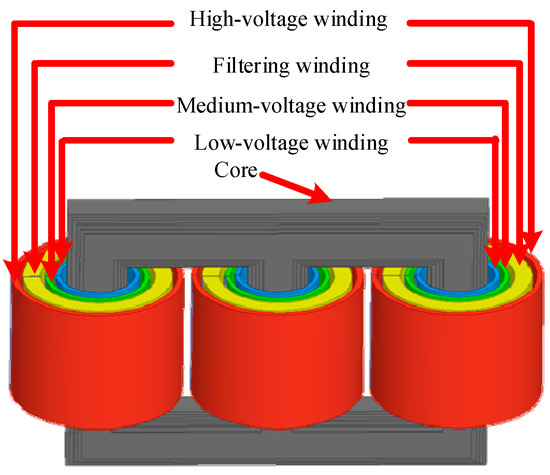 Regarding the FW-IFT, there are HV-, filtering-, MV-, and LV-winding, which is established in ANSOFT/MAXWELL software (ANSYS 16, ANSYS Inc, Shanghai, China), as shown in Figure 3.
