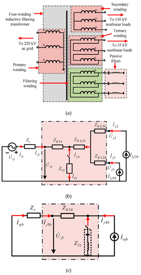The nonlinear loads at the MV and LV side are equivalent to the harmonic current resources , , respectively, and considering the possible harmonic voltage from the utility grid, there is also the equivalent harmonic voltage source and system impedance at the grid side. When the load harmonic currents occur in the MV and LV side, the designed passive filters are connected to the filtering winding of the FW-IFT for implementing inductive filtering. At this time, the hth-order harmonic voltage transfer equations can be obtained as follows: