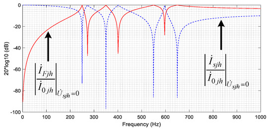 The inductive filtering system consists of passive filters in series with the filtering winding as shown by a single-phase equivalent decoupling circuit in Figure 4c. Harmonic currents will be induced by these passive filters to offset those of the load side, while the load reactive currents are damped by the IF system. From Equation (6), when the background harmonic voltage = 0, the ratio between the grid harmonic current and the nonlinear load is presented as: