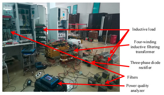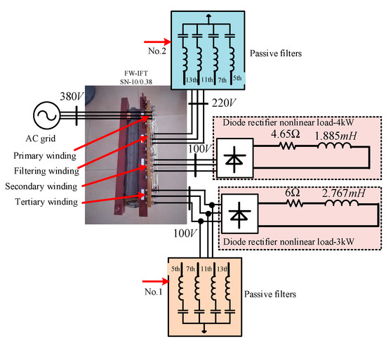 Figure 7 shows many components of the experiment, including the prototype of the manufactured FW-IFT, the three-phase diode, ac inductance, the resistance box, and passive filters. Passive filters installed in filtering winding of 220 V is the IF method, while passive filters installed in tertiary winding of 100 V is the IF method. Table 1 summarizes the nameplate parameters of the FW-IFT. Table 2 gives the parameters of four sets of passive filters by comparing the PF method with the IF method. The capacity of each designed passive filter based on both the PF method with the IF method is rated at 200 Var and 50 Var, respectively.