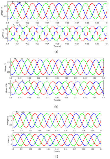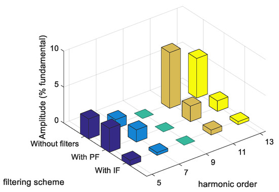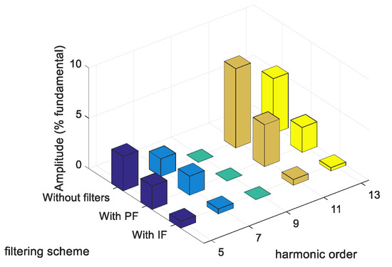 Figure 10 shows the three-phase voltage and current measured waveforms at the 380 V bus. Figure 11 shows the phase-A current spectra at the 380 V bus, where the fundamental rms current amplitude values are 14.06 A, 14.75 A, and 16.97 A, and THDi are 10.76%, 5.67%, and 1.63%, respectively, from the three types of filtering scheme (without filters, with PF and with IF).