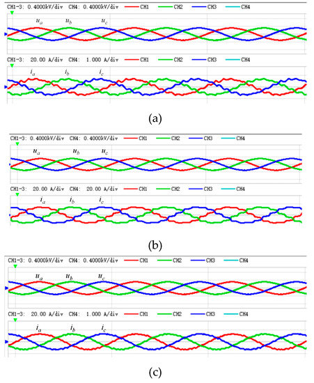 From this, it can be clearly seen that Equation (10), obtained from the equivalent circuit model, verifies the correctness of the established mathematical model. From the above equation, when the harmonic current flows into the load winding of the FW-IFT from the harmonic resource, the filtering winding inducts the corresponding harmonic current to counteract it, and thus, there is no or few inducted harmonic currents at the grid side, as long as the associated harmonic impedances , , can be ensured.