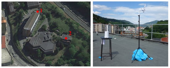 The university building of Eibar (Engineering School of Gipuzkoa) was selected (longitude: 2.946 W; latitude: 43.258 N) to demonstrate a method for formulating a preliminary estimation of energy production using quantile-matching calibration versus a cup anemometer installed on the roof. Figure 1 shows a satellite view of the engineering school and the position of two anemometers installed on two buildings. After eight months of data acquisition, Anemometer 1 showed the best correlations with the ERA5 reanalysis, and its dataset was used for the calibration and energy estimation procedure.