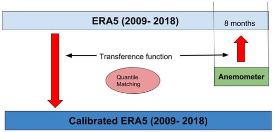 For this approach, several other terms can be found in the literature: “probability mapping” [], “quantile-quantile mapping” [,], “statistical downscaling” [], and “histogram equalization” []. With this general approach, empirical quantile-mapping bias correction was applied to calibrate ERA5 versus an anemometer in the building. In [], the same procedure was used for estimating wind energy trends. To summarize, this method of calibration or bias correction is fundamentally statistical, and the idea is to match values with the same quantile in two empirical probability distributions: the one to be calibrated (ERA5), and the one that is the basis for the calibration (anemometer). Figure 2 illustrates the main aspects of this calibration procedure, including the intersection periods and the concept of applying the transference function.
