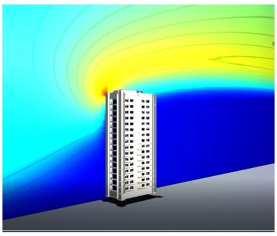 The effect of wind against buildings has been largely studied by the architectural sector for the purpose of studying the dynamic loads generated by air streams. Because of their work, there is considerable knowledge about the behavior of wind in urban environments. Much of the information has been obtained through experiments with scale models and CFD simulations, similar to the depiction generated by the authors in Figure 3, which was re-created based on the CFD simulation in [].