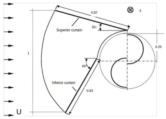 In their seminal work about a curtain design to increase the performance of a Savonius turbine, Altan et al. [] determined that the best angles for the capture of wind in their curtain design are for the superior vane and for the inferior one that obstructs the negative torque. The authors corroborated the same influence of the inferior vane in the laboratory (see Section 3.1). Figure 5 shows the dimensions for this optimum design with curtains. It is considered a unit of capture width at the inlet, and a geometrical relation of 4:1 for the inlet width (0.25, therefore diameter of 0.50) versus the outlet width. The aspect ratio is six considering the results of Roy and Saha []: . These proportions can be established between a capture width of one and two meter; within this size, ROSEO device is manipulable for a worker on the roof in the implementation process and for O&M issues, without the need of a crane.