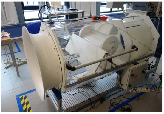 Table 1 describes the main characteristics of the above-mentioned wind tunnel. Figure 6 shows the wind tunnel and the installation of a PAGV and a real Savonius rotor. It should be mentioned that the disposition of the vane below the limit of the rotor’s horizontal axis obstructs the negative torque and, simultaneously, accelerates the stream in the opened drag side above the axis. As mentioned, this aerodynamic effect has been properly documented in previous reviews about the performance of the Savonius rotor [,,].
