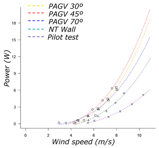 Although a maximum outlet/inlet width ratio of 1.4 can be obtained due to the lack of space in the tunnel with the Savonius rotor in the center, the instantaneous power measured for different wind speeds and different angles of the vane in Figure 6 gives a coherent result for this augmentation and subsequent power. Figure 8 shows this behavior with the vane at 30, 45 and 70 with respect to the horizontal. The pilot test was developed without the vane and the negative-torque wall (NT wall) was applied with the vane in vertical position, obstructing the negative torque’s drag. It should be noted that, removing the negative torque, the power is doubled and the other cases (30, 45 and 70) also remove the negative drag.