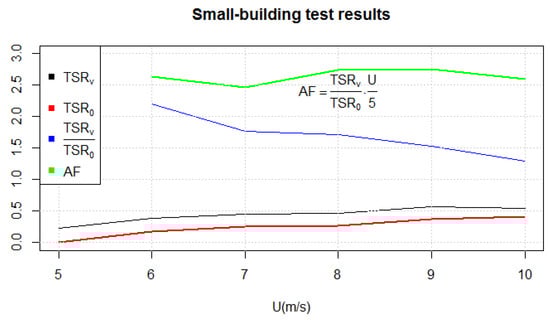 In this case, for each wind speed is measured instead of the . Consequently, the ratio of the s with () and without () the vane should be corrected according to the rotor speed, since the torque is incremented with the speed. Figure 9 shows these results: both TSRs, their ratio, and the corrected ratio that equals . This correction factor is established by the increment relation between U and the cut-in wind speed for the pilot experiment (5 m/s). A logical step in the procedure considering the constant speed–torque relation of the DC generator, since both TSRs (therefore, the rotor speeds) are practically linear with respect to U and also fulfill the same increment relation. Thus, is between 2.5 and 3, a very relevant result given the fact that the inlet–outlet width relation is 3:1. The 4:1 relation of the initial configuration could not be installed yet, due to the sensible construction details of the small model. Because of this delicate structure, the fabrication process of which has been very laborious, the free wind speed range in the tunnel has been kept below 10 m/s.