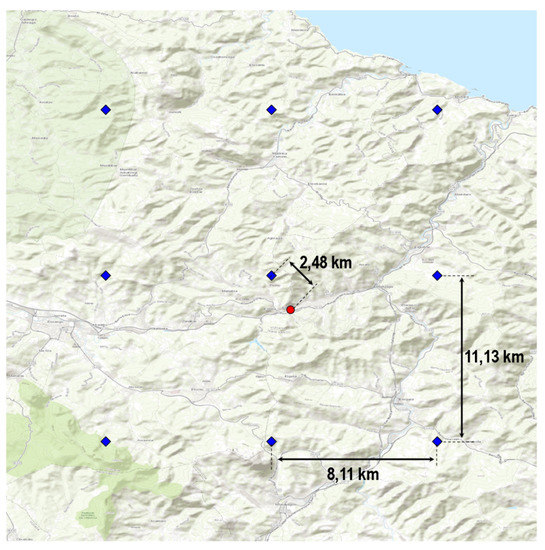 The ERA5 grid around Eibar city is shown in Figure 10 with the ERA5 points in blue. The building on which the anemometer is located is marked in red. The nearest grid point, at a distance of 2.48 km, was chosen to perform the calibration.