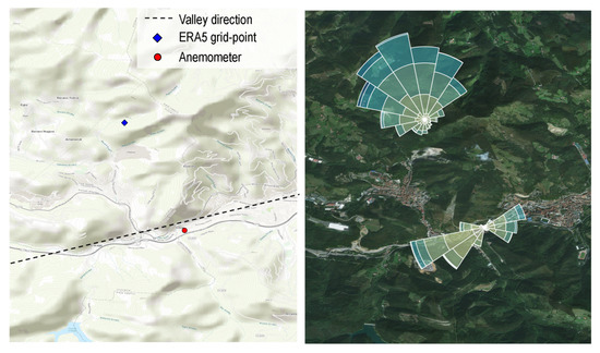 Details of the location of the anemometer and the nearest ERA5 grid point (left). Representation of the corresponding wind roses of ERA5 and anemometer data (right).